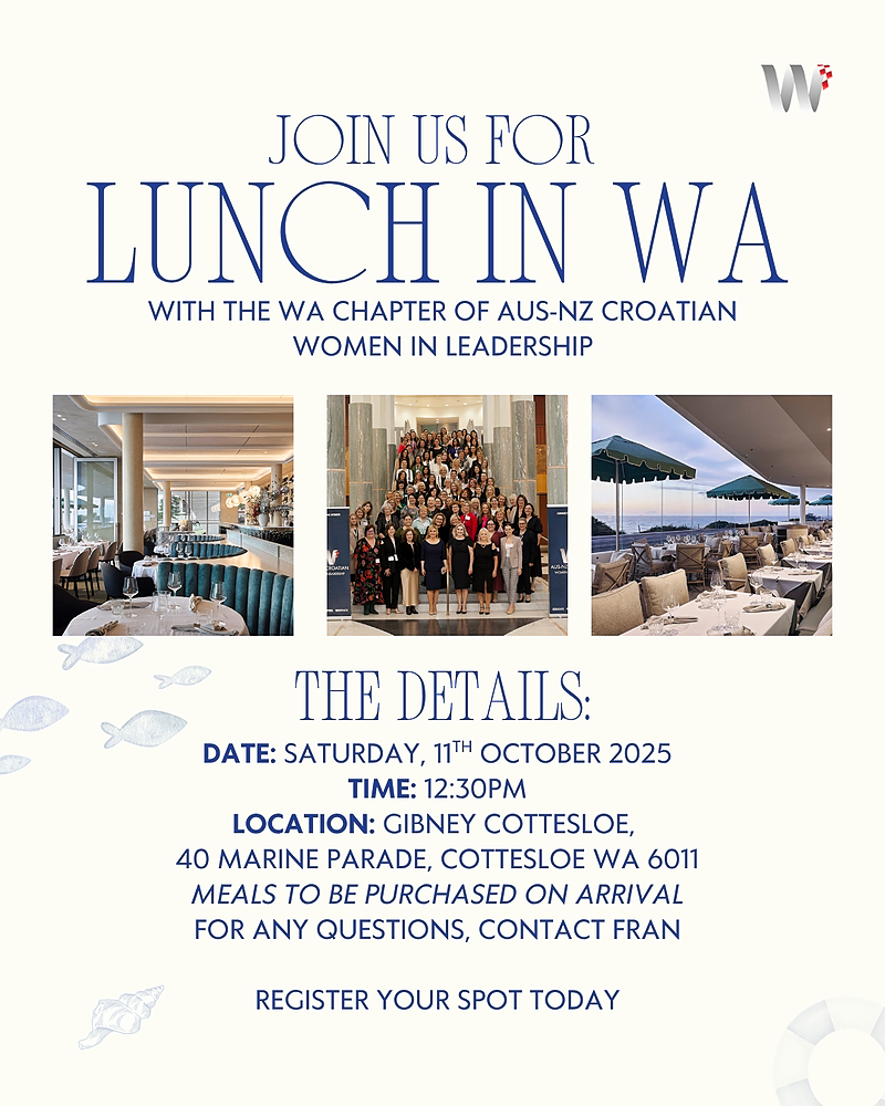 Join us for a beautiful afternoon of connection, culture, and conversation at the AUS-NZ Croatian Women in Leadership WA Luncheon, held on Saturday, 11 October at 12:30pm at Gibney, Cottesloe.
